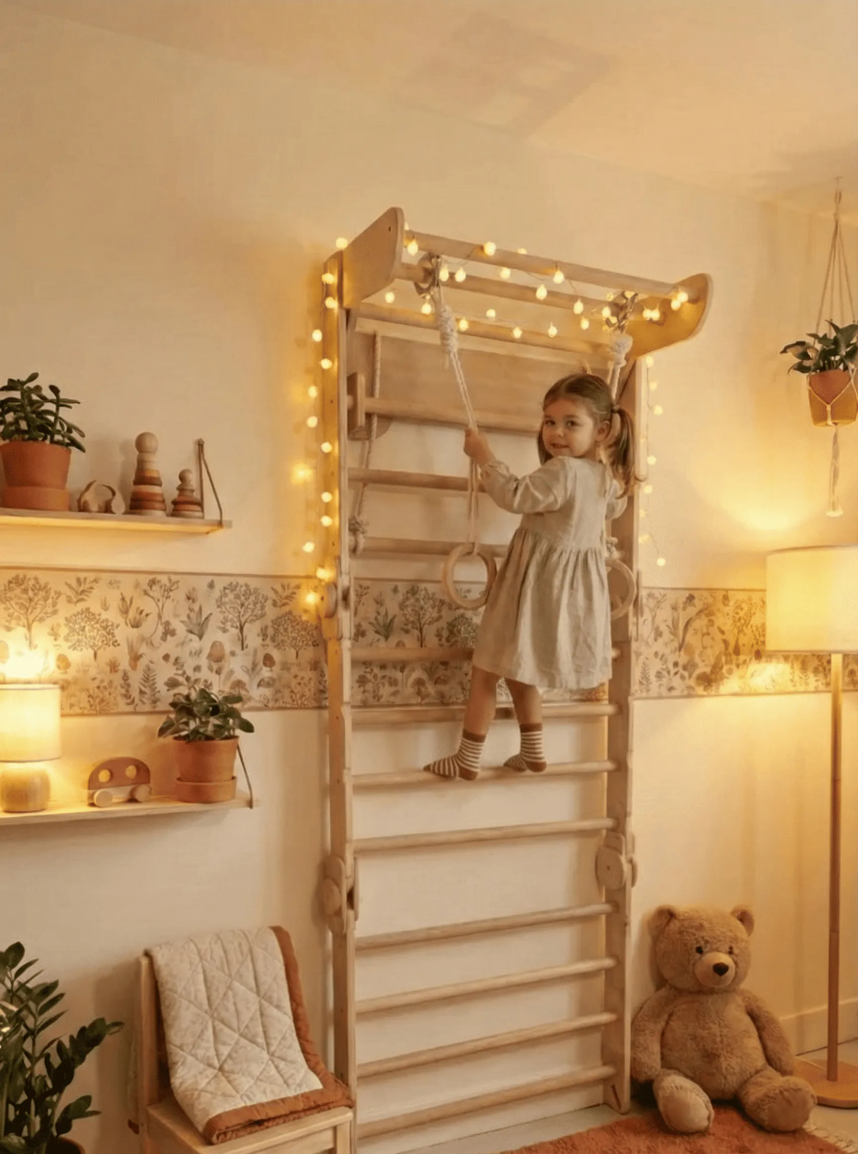 Nuestra estructura de escalada está diseñada para fomentar la motricidad gruesa, la coordinación y el equilibrio, siguiendo los principios del método Montessori.