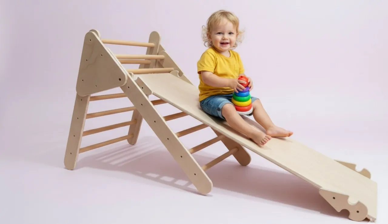 Conjunto Montessori de triángulo de escalada y rampa reversible. Fabricado en madera natural, ideal para el desarrollo motriz, equilibrio y autonomía infantil.