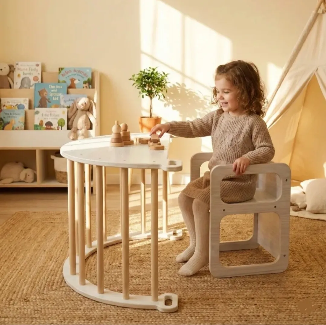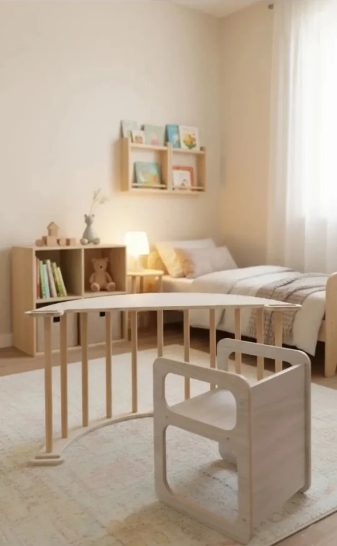 Incluye un balancín 8 en 1 que se convierte en balancín, puente, tienda, mesa de juegos y mucho más, ofreciendo infinitas posibilidades para estimular el equilibrio, la coordinación y el juego libre. Además, incorpora una silla 3  en 1 que puede utilizarse como silla o como mesita auxiliar, adaptándose a sus diferentes etapas y necesidades.