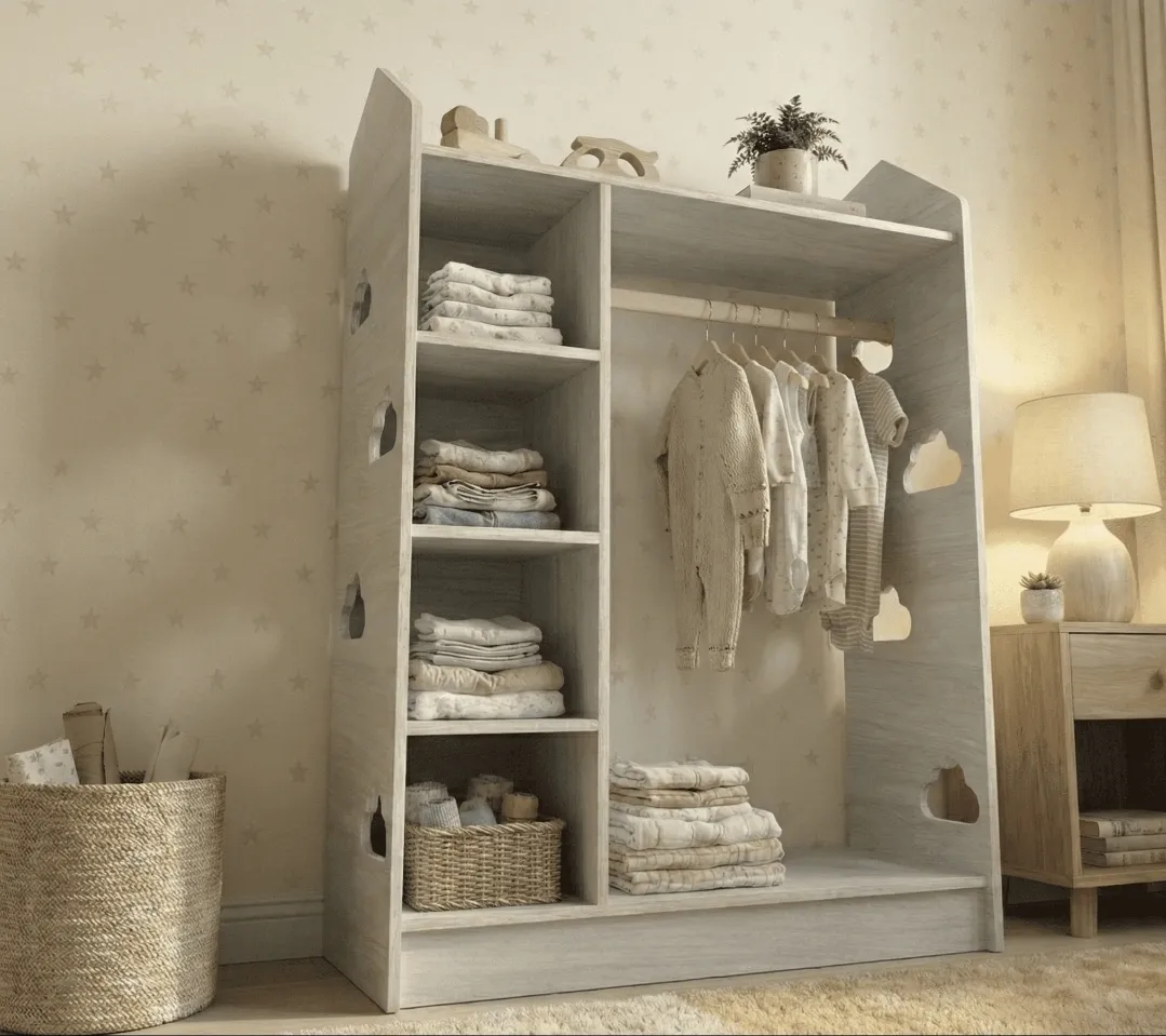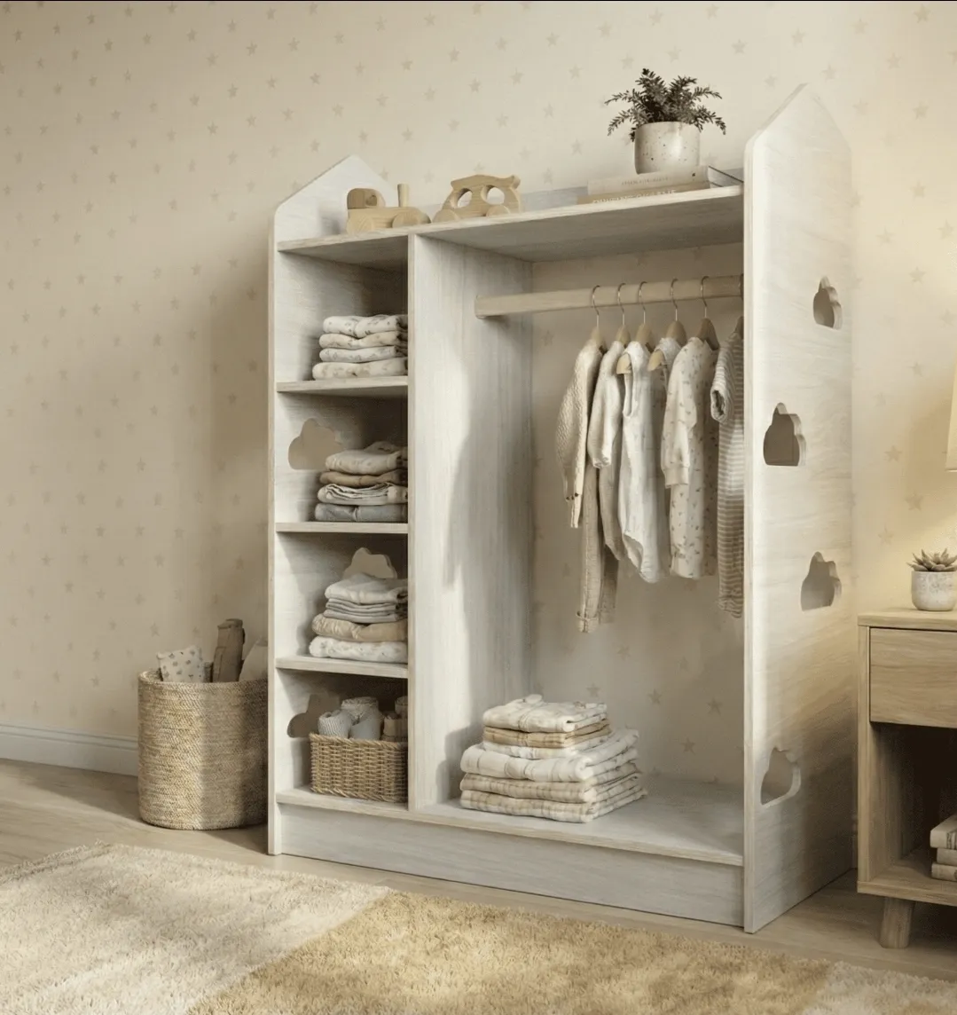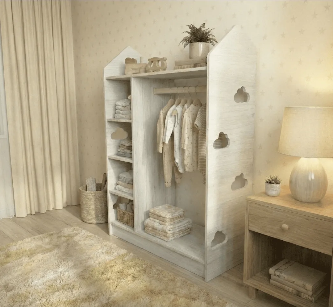 Con estantes abiertos, barra de colgar baja y un diseño minimalista de líneas suaves, permite que el niño elija y organice su ropa de forma autónoma, siguiendo los principios del método Montessori.