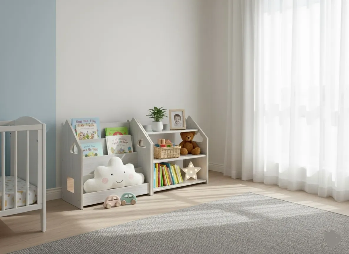 La estantería de juguetes ofrece un lugar perfecto para que puedan guardar, descubrir y ordenar sus materiales de forma sencilla, aprendiendo a ser responsables de su propio espacio.