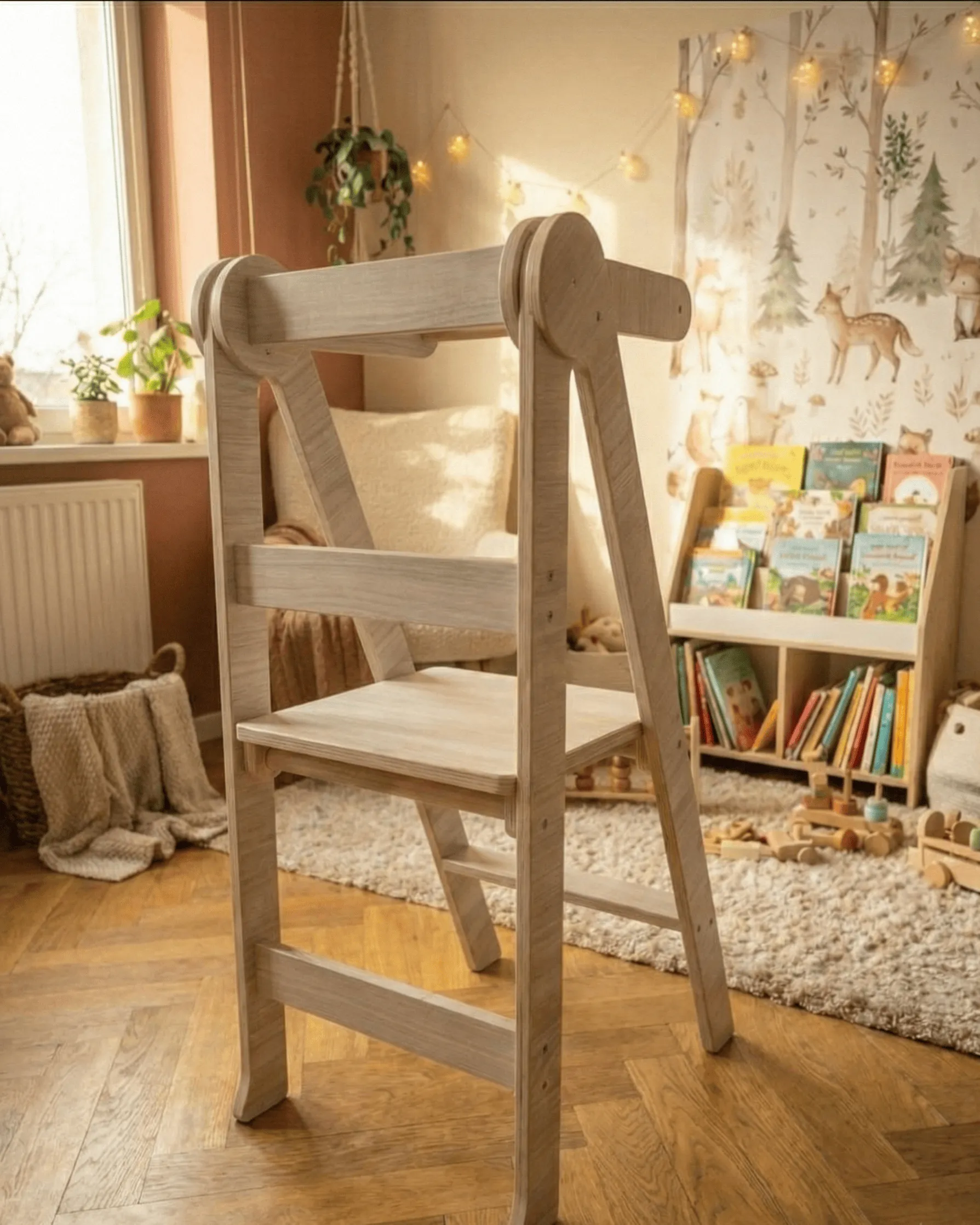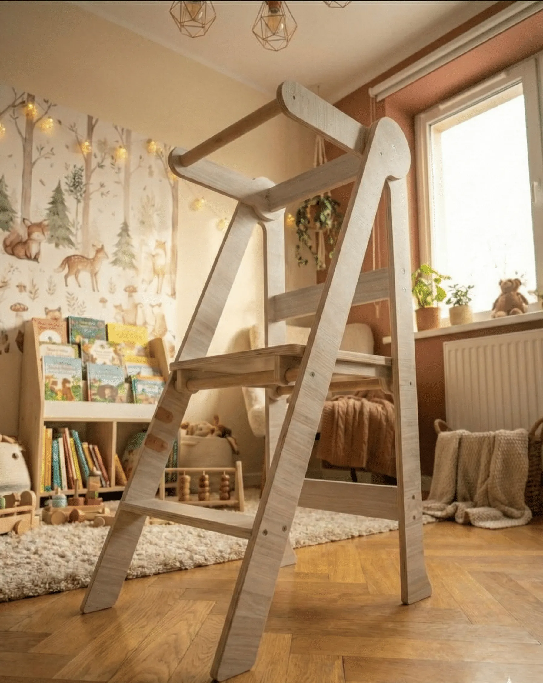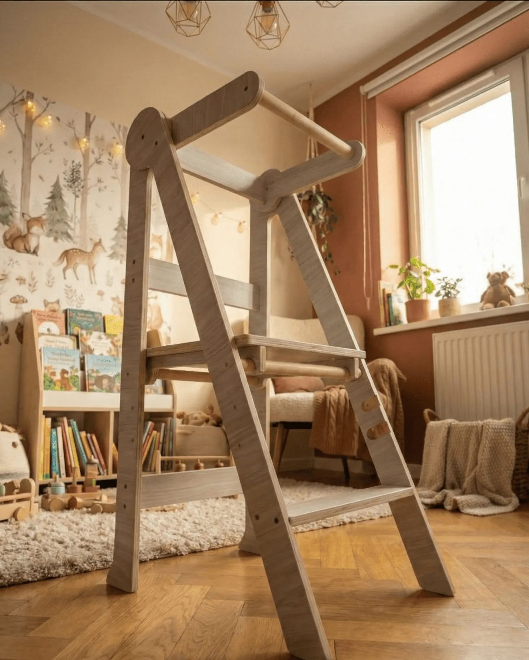 Acompaña el crecimiento de tu peque con esta torre Montessori. Ajustable en 3 alturas, segura y estable, se pliega fácilmente para guardarla sin ocupar espacio. Ideal para fomentar su autonomía en la cocina, baño o juegos.