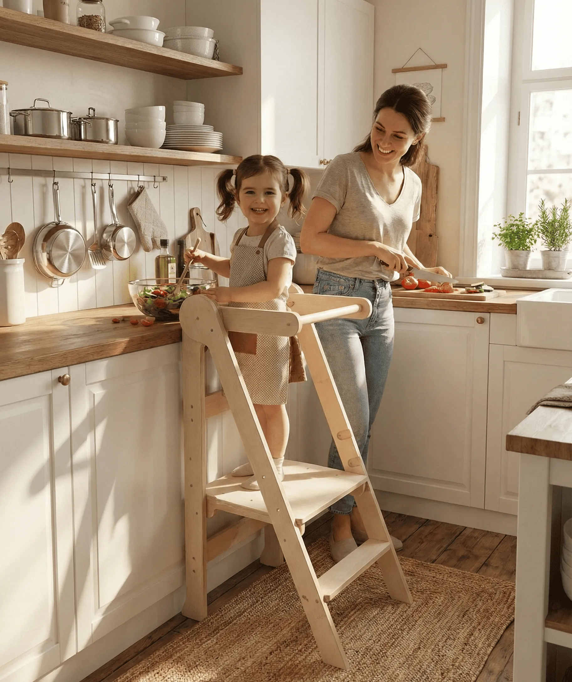 Acompaña el crecimiento de tu peque con esta torre Montessori. Ajustable en 3 alturas, segura y estable, se pliega fácilmente para guardarla sin ocupar espacio. Ideal para fomentar su autonomía en la cocina, baño o juegos.