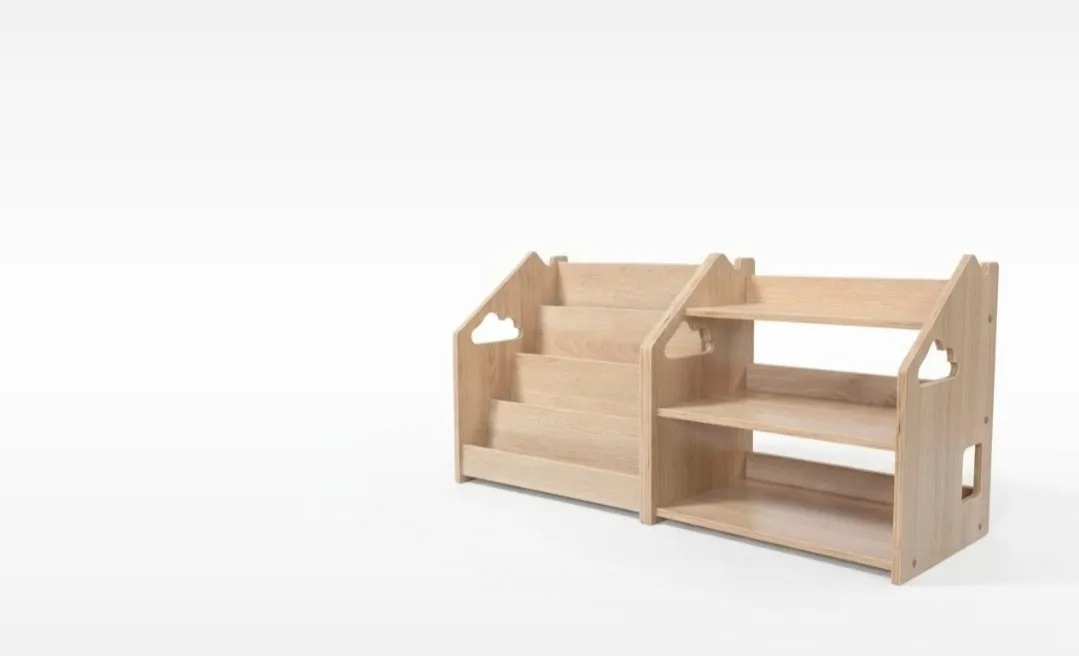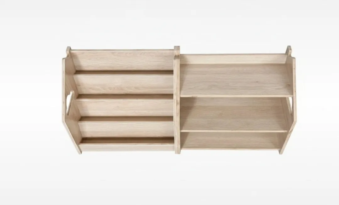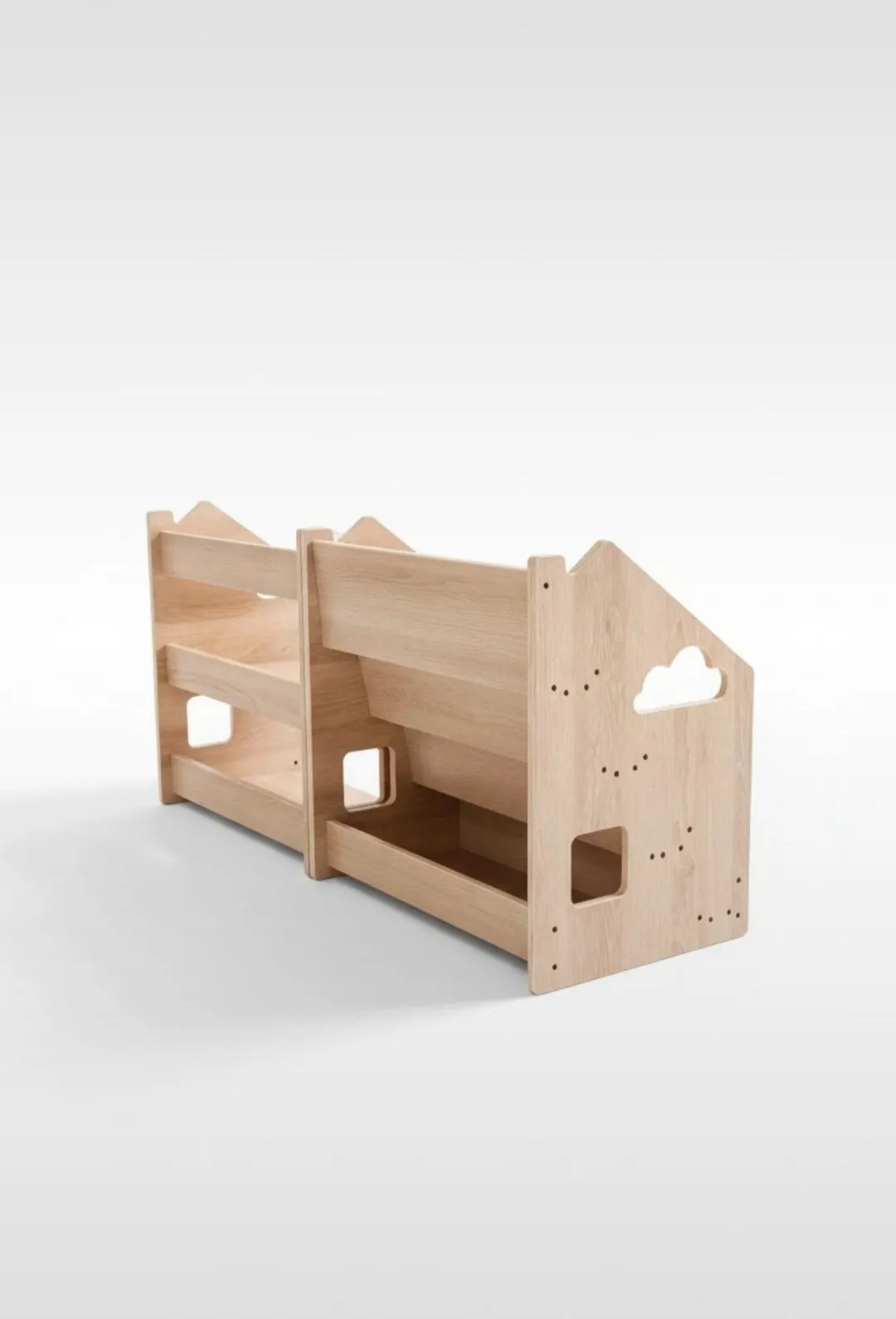 Estantería y librería Montessori de madera natural, accesible para los ninos @Organiza libros y juguetes mientras fomentas autonomía, orden y amor por la lectura desde temprana edad