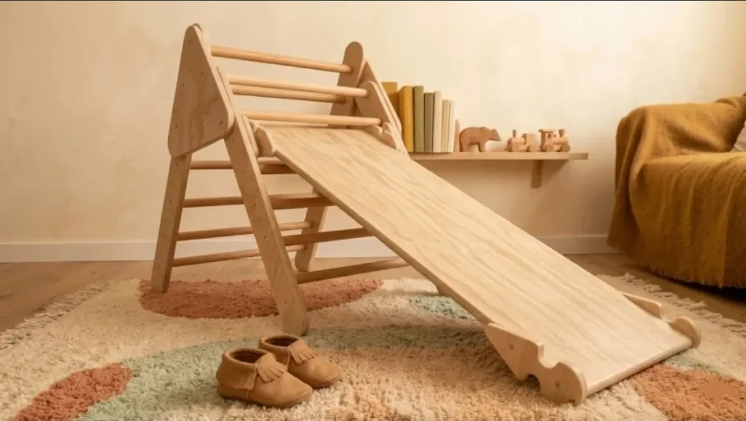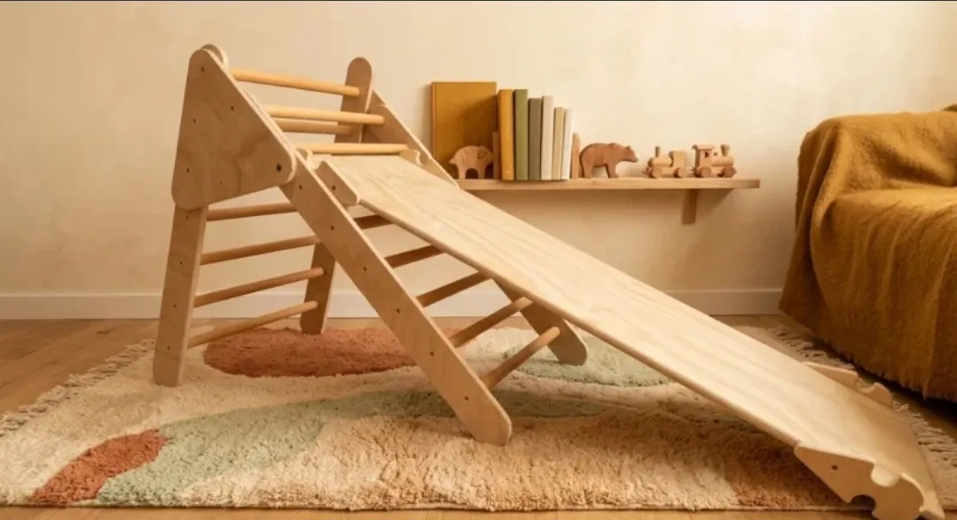 Conjunto Montessori de triángulo de escalada y rampa reversible. Fabricado en madera natural, ideal para el desarrollo motriz, equilibrio y autonomía infantil.